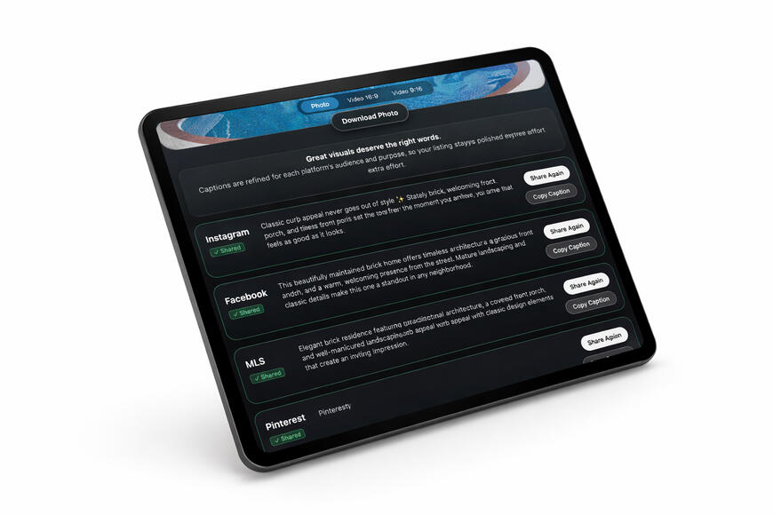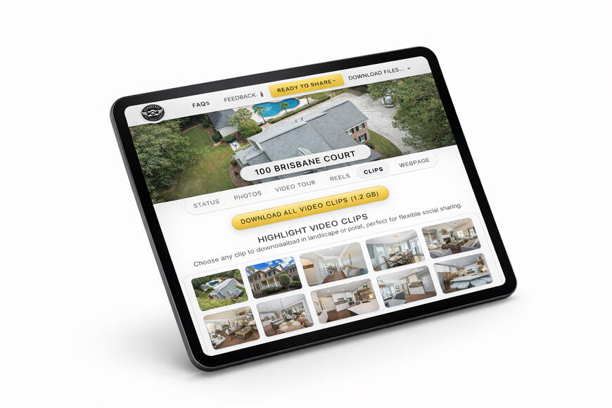 High-polish real estate photography and AI video, delivered through a simple client portal with everything ready to share.